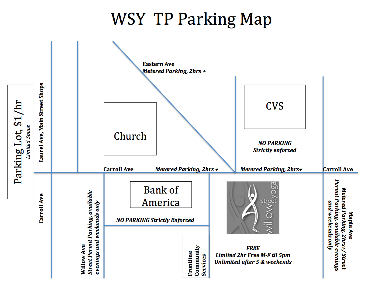 See below for Willow Street Yoga’s Parking Map (North is to the Right) & List of possibilities. (This information is supplied by the studio: I cannot guarantee its accuracy.)