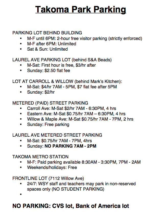 The Takoma Park Studio is within easy walking distance from the Takoma metro station. This information is supplied by the studio: I cannot guarantee its accuracy.